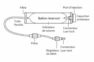 Il s’agit d’un dispositif médical stérile à usage unique appelé pompe élastomérique ou diffuseur de médicament portable. De par sa simplicité de préparation et le confort apporté au patient, le diffuseur est largement utilisé dans le cadre de la perfusion ambulatoire. Il se décline en modèle courte durée 30 mn à 4h ou longue durée 12h à 11 jours.